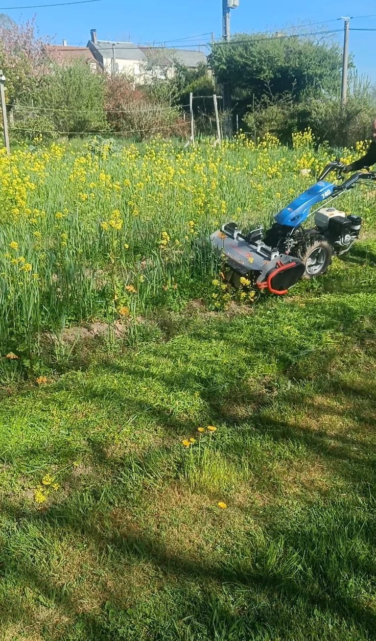 Au printemps, environ 2 mois avant la plantation, on broit les engrais verts, avec l'aide de notre unique machine à moteur présente sur la ferme (équipé de 3 outils différents, qui nous aident à structurer les planches du jardins).
