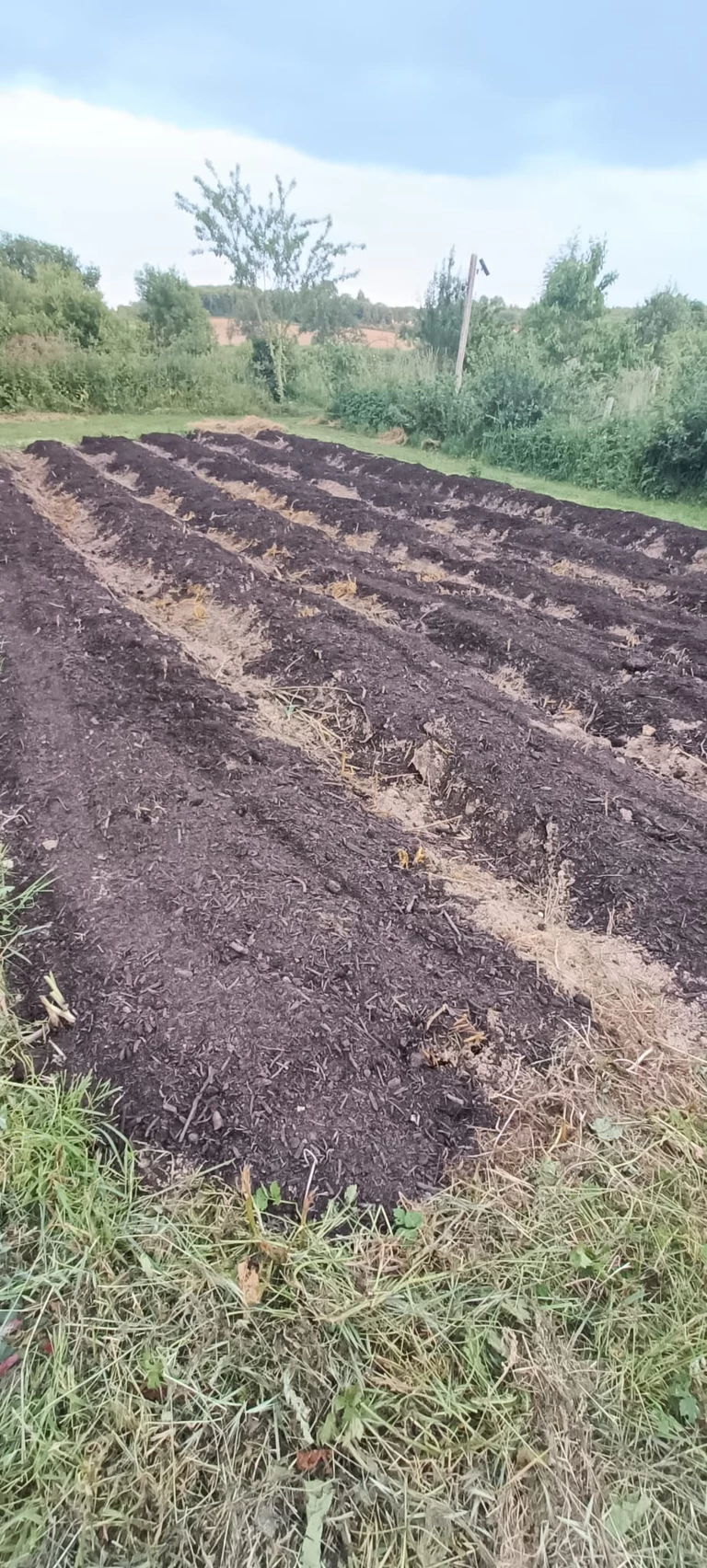 Après environ 6 semaines de couverture, on enlève les bâches noires, on recouvre de compost et on rebachera avec de la toile tissée, pour limiter la concurrence racinaire des adventices (aussi appelées "mauvaises herbes").