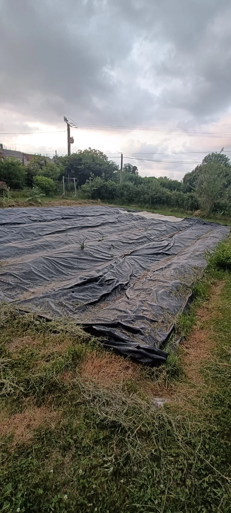 Une fois les engrais verts broyés, les planches reçoivent encore un peu de fientes de poules (apport d'azote) et de consoude hachée (apport de potassium), puis sont couvertes de bâches noires, afin d'optimiser la désintégration des engrais verts broyés, de garder l'humidité du sol, et de favoriser la remontée des vers de terre ainsi que toute la vie microscopique présente dans le sol.